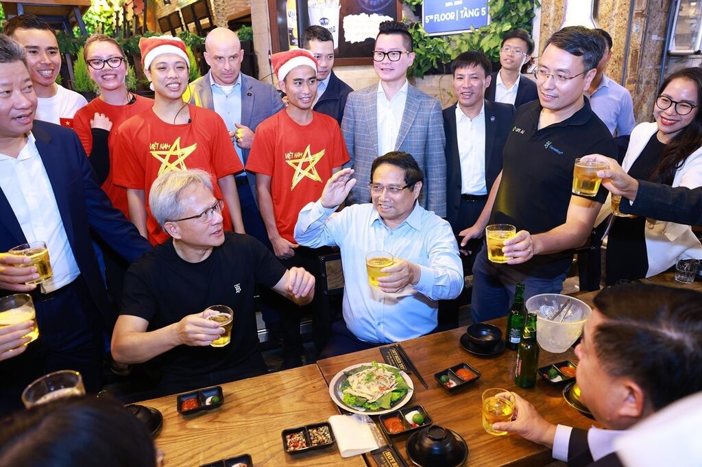 | Le Premier ministre vietnamien Pham Minh Chinh (assis à droite) et le PDG de NVIDIA Jensen Huang (assis à gauche) apprécient la cuisine de rue de Hanoï, le 5 décembre 2024. |