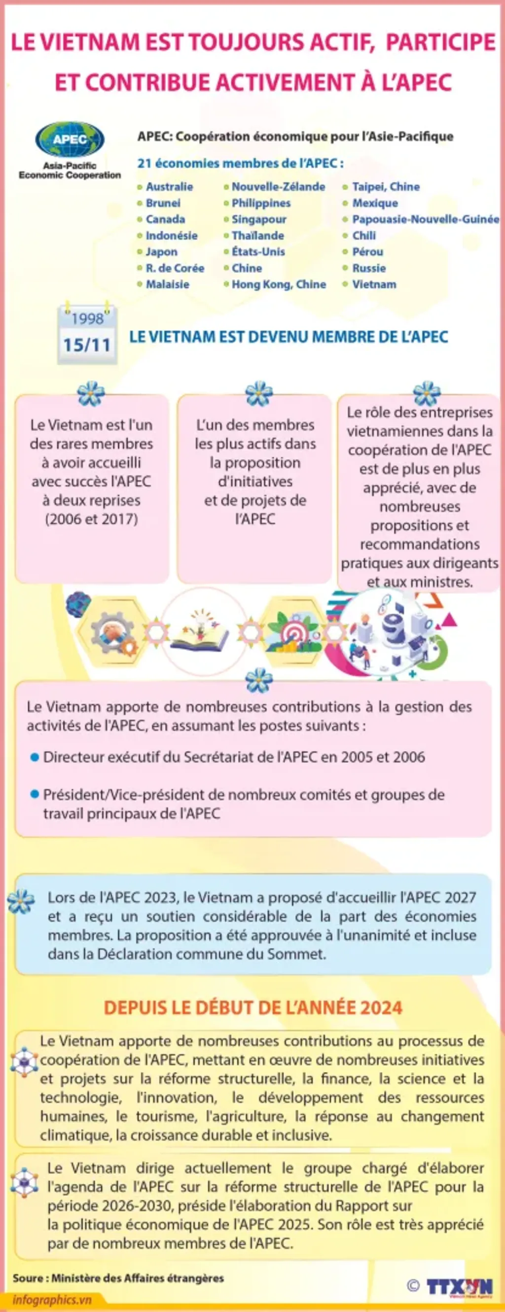 Le renforcement de la coopération économique multilatérale permet au Vietnam d'affirmer sa position sur la carte économique mondiale. L'année 2024 a ainsi été marquée par des avancées décisives du pays dans l'approfondissement des relations stratégiques, notamment au sein des principaux forums multilatéraux tels que les Nations unies, le Forum de coopération économique Asie-Pacifique (APEC), l'ASEAN, le Groupe des Sept (G7), le Groupe des 20 (G20) ... Les propositions et initiatives du Vietnam en matière de transformation numérique, de transformation verte, de gouvernance mondiale et de chaînes d'approvisionnement durables, contribuent à façonner les ordres économiques régionaux et mondiaux vers l'ouverture et la durabilité.