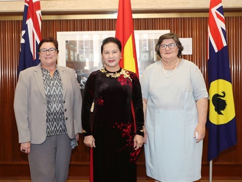 | La présidente de l’AN vietnamienne Nguyên Thi Kim Ngân entourée de la présidente du Conseil législatif d’Australie-Occidentale, Kate Doust (droite) et de la vice-présidente de l’Assemblée législative d’Australie-Occidentale, Lisa Baker, le 1er décembre 2017 à Perth. |
