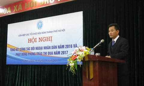 À cette occasion, le vice-président permanente de la HAUFO, Cân Viêt Anh, a rappelé les activités marquantes en 2016 de son organisation : un concours international de peinture sur le thème «J’aime Hanoï - ville de paix» qui a réuni une centaine d’enfants vietnamiens et étrangers, la «Course du journal Hà Nôi Moi : pour la paix» (43e édition) qui a vu la participation de plus de 300 coureurs étrangers, l’exposition de peinture «Je peins le Vietnam - Je peins la Russie» qui marquait le 66e anniversaire des relations entre les deux pays, la «Course pour les enfants hanoïens».