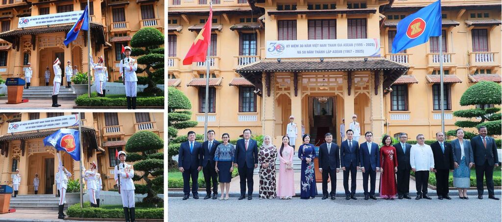 | La levée du drapeau de l'ASEAN pour célébrer le 30e anniversaire de l'adhésion du Vietnam à l'ASEAN. |