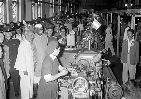 | Le Président Hô Chi Minh et le président indien Prasat ont visité l'usine de machines-outils No1 de Hanoï, le 24 mars 1959. |