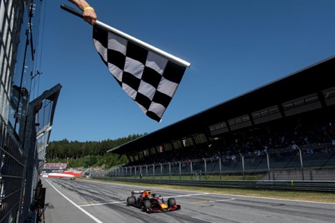 | Le pilote néerlandais Max Verstappen passe la ligne d'arrivée lors du Grand Prix d'Autriche de Formule 1 le 30 juin 2019 sur le circuit de Spielberg. |