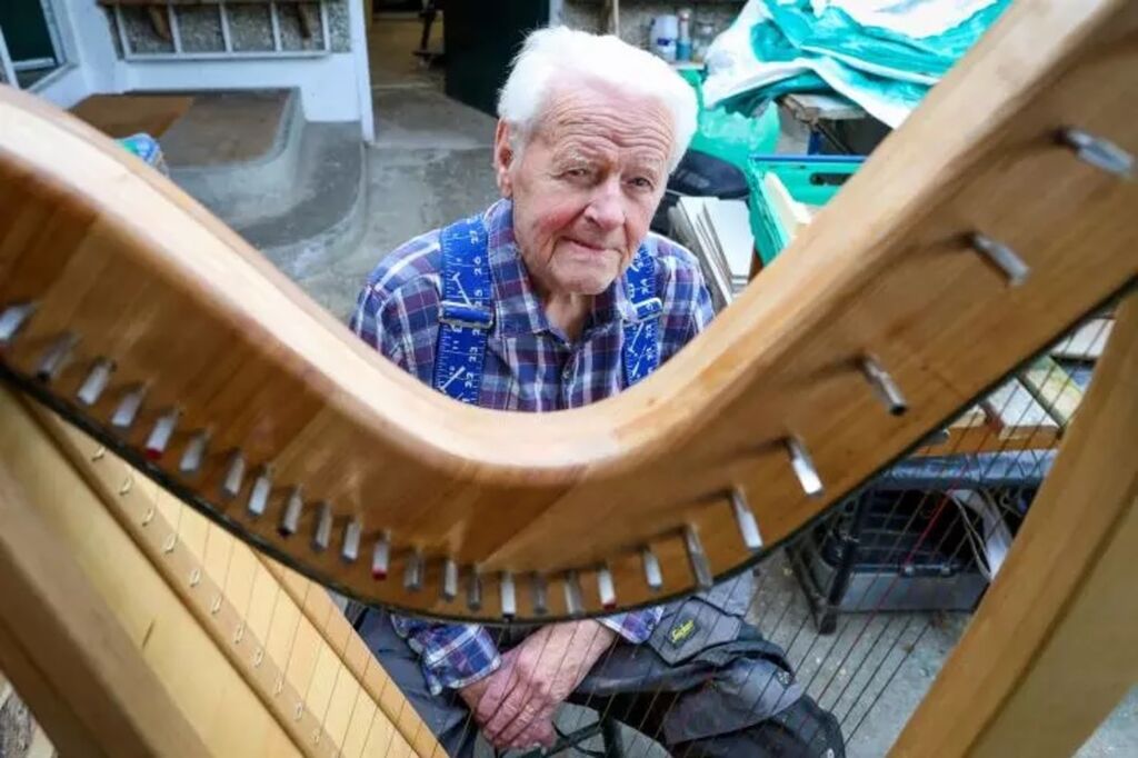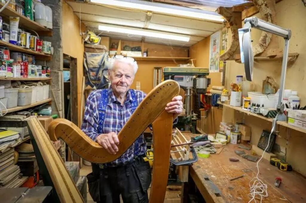 Autrefois enseignant de menuiserie et de métallurgie, cet homme, qui fêtera ses 90 ans en novembre, ne s'est attelé à la fabrication d'une harpe qu'à 82 ans, pour rendre service à un ami.