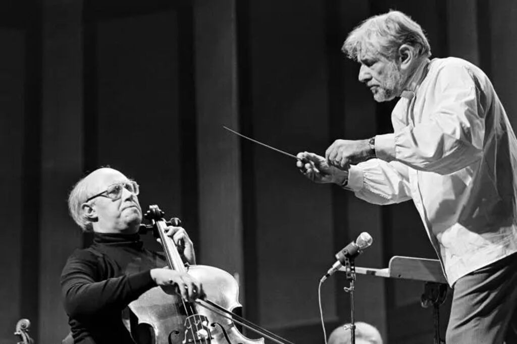 | Le violoncelliste russe Mstislav Rostropovitch (gauche) joue sous la direction du chef d'orchestre américain Leonard Bernstein lors d'un concert au théâtre des Champs Élysées à Paris, le 8 novembre 1976. |