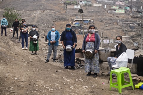 | Des Péruviennes attendant le soutien alimentaire en banlieue de la capitale Lima. |