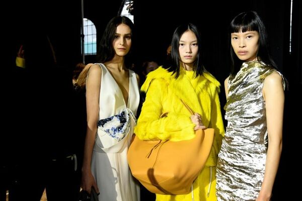 | Des mannequins arborent des sacs lors du défilé de Prada à Milan, le 18 juin. |