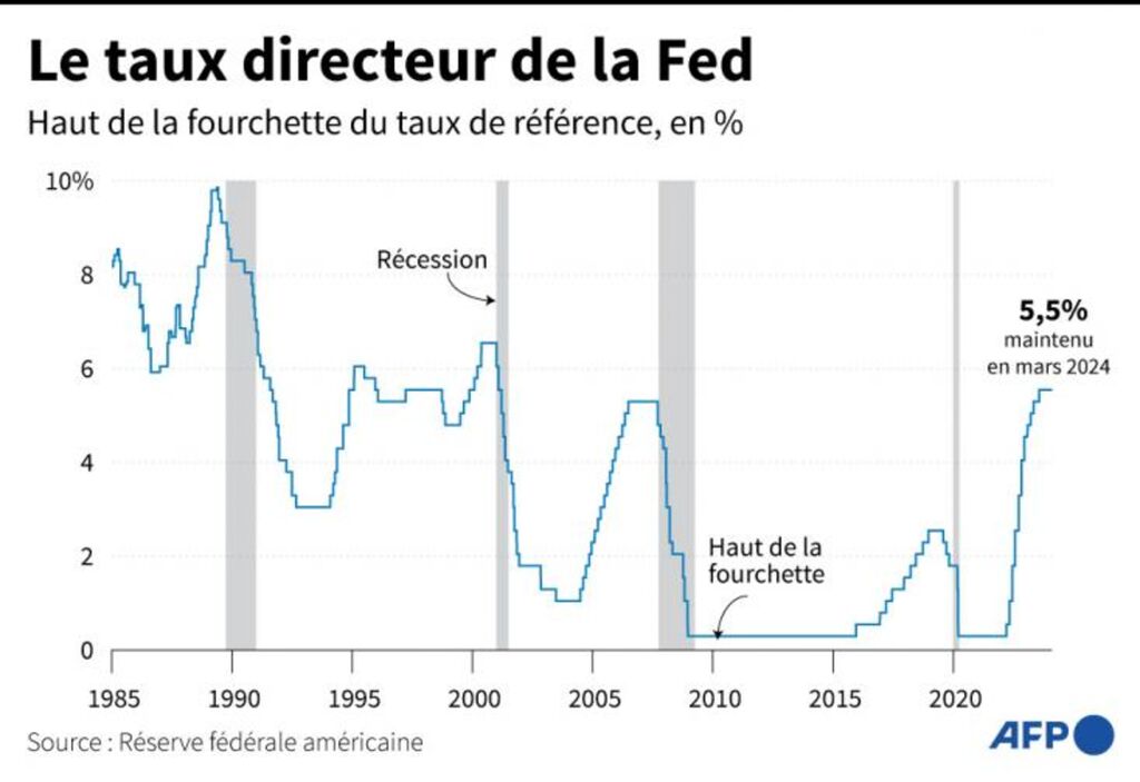 Les taux au jour le jour restent entre 5,25% et 5,50%, a annoncé la Fed dans un communiqué, après une décision unanime des membres du Comité monétaire (FOMC).