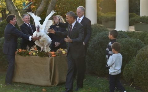 Barack Obama de son côté a affirmé que cette fête, pour laquelle il a gracié deux dindes comme le veut la tradition présidentielle, était l'occasion de passer "des sondages à la volaille" ("polls to poultry" en anglais).