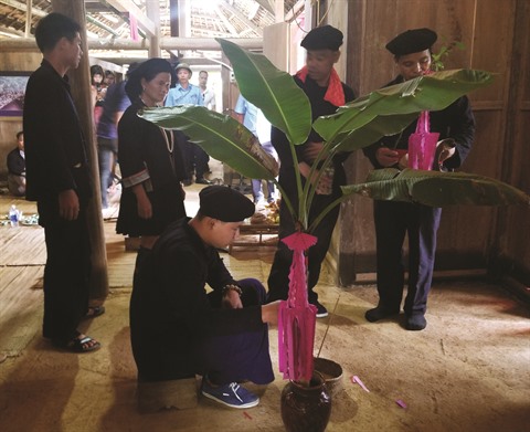 Lors de cette journée choisie, l’hôte convie les cousins et le chaman à la cérémonie. Celui-ci porte le costume traditionnel indigo de l’ethnie H’mông, un béret et apporte quelques objets.