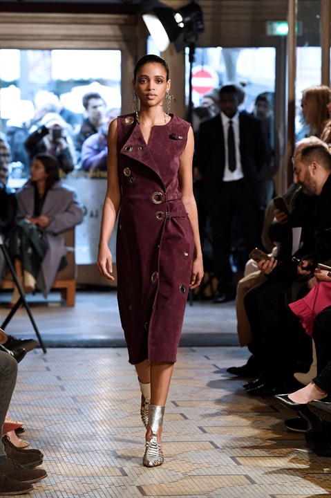 La directrice artistique d'Hermès, Nadège Vanhée-Cybulski, avait planté des tentes transparentes dans les jardins d'un lycée parisien, dont les allées étaient recouvertes de gravier rouge grenat. Dans une ambiance entre chien et loup défilent des femmes élégamment parées pour les grands espaces, avec des canadiennes, des parkas, des manteaux couverture, qu'elles portent aussi parfois en bandoulière, grâce à des anneaux et une sangle.