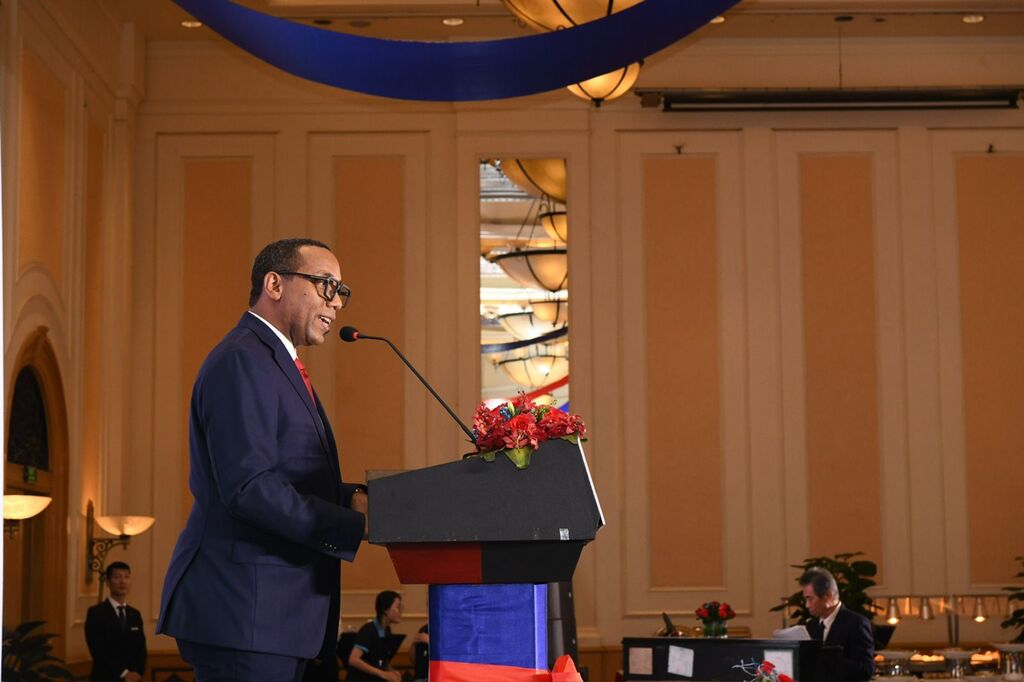 | L’ambassadeur d'Haïti, Jean Lesly Benoit, prend la parole lors de la 221e Fête du drapeau d'Haïti, le 16 mai à Hanoï. |