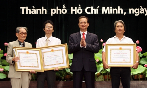 | À l'occasion du 67e anniversaire de la Révolution d'Août (19 août) et de la Fête nationale (2 septembre), le Premier minitre Nguyên Tân Dung (2e à droite) a remis le prix Hô Chi Minh à nombreux individuels, le 2 septembre à HCM-Ville. |
