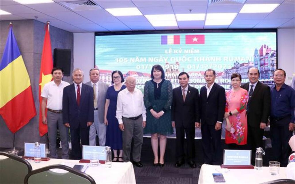 | Cristina Romila (centre), ambassadrice de Roumanie au Vietnam, avec des délégués lors de la cérémonie pour célébrer le 105e anniversaire de la Fête nationale de la Roumanie, le 27 novembre à Hô Chi Minh-Ville. |