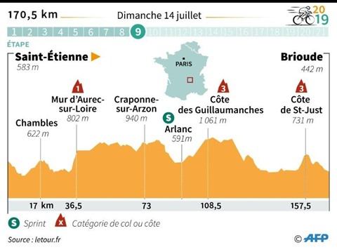 | Profil de la 9e étape du Tour de France, longue de 170,5 km de Saint-Étienne à Brioude, le 14 juillet. |