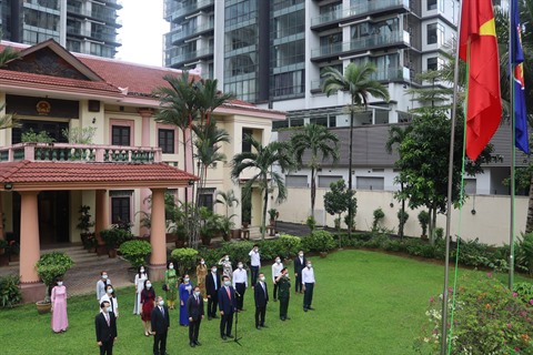 | Cérémonie de salut au drapeau national au siège de l'ambassade du Vietnam en Malaisie en l'honneur de la Fête nationale. |