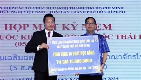 | Le consul général de Thaïlande à Hô Chi Minh-Ville, Apirat Sugondhabhirom (droite), a remis dix bourses au Fonds de bourses d'études de l'Association d'amitié Vietnam - Thaïlande de Hô Chi Minh-Ville. |