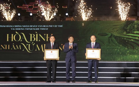 Présente à la cérémonie, la vice-présidente de la République, Vo Thi Anh Xuân, a félicité l’ethnie Muong et, plus généralement, tous les groupes ethniques de la province de Hoà Binh, pour l’inscription de la fête traditionnelle "Khai ha" et du calendrier "Doi" de l’ethnie Muong au patrimoine national.