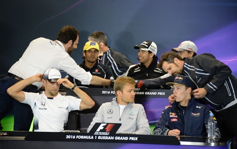 | Des pilotes F1 dans la salle de conférence sur l'autodrome de Sotchi, le 28 avril 2016. |