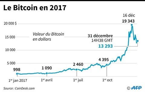Cela malgré l'extrême volatilité de cette crypto-monnaie. Elle a commencé l'année 2017 autour de 1.000 dollars et a frôlé les 20.000 dollars en fin d'année, après une flambée erratique à l'approche des fêtes. Elle cotait vendredi autour de 15.000 dollars.