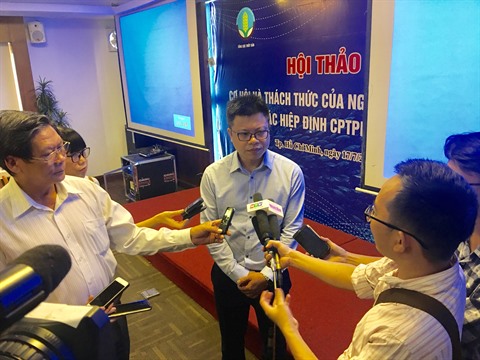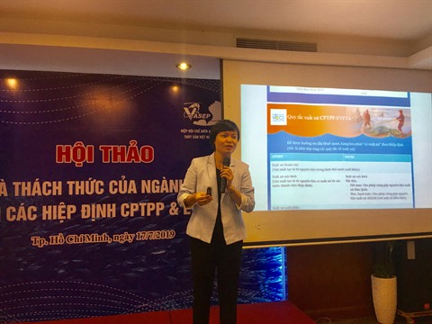 | Nguyên Thi Thu Trang, directrice du Centre de l’Organisation mondiale du commerce et de l’intégration de la VCCI présente des opportunités et défis des accords CTPPP et EVFTA aux entreprises. |