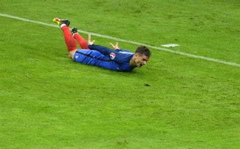 | Antoine Griezmann fête son but, avec l'équipe de France, contre l'Islande au stade de France, le 3 juillet à Paris. |