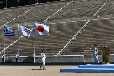 | Un athlète assure le dernier relais de la flamme olympique avant la cérémonie de sa remise solennelle au Japon, le 19 mars à Athènes. |