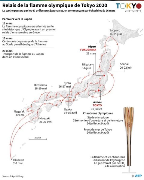 | Carte du Japon montrant le parcours de la flamme olympique, qui débute son parcours à Fukushima le 26 mars. |