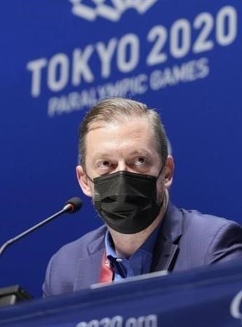 | Le président du Comité international paralympique, Andrew Parsons lors d'une conférence de presse à Tokyo, le 23 août. |