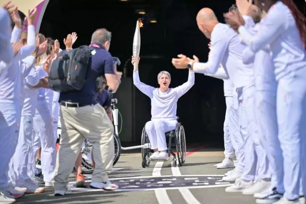 | L'ex-médaillée en escrime-fauteuil, Emmanuelle Assmann, arrive à Coquelles via le Tunnel sous la Manche, avec la flamme paralympique, le 25 août. |