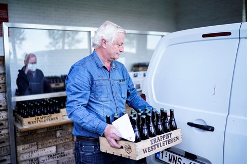 | Un client transporte une caisse de bières Westvleteren à la sortie du magasin de l'abbaye Saint-Sixtus abbey, à Westvleteren en Belgique, le 14 mai. |