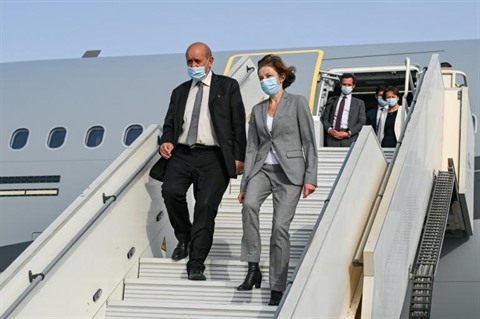 | Le chef de la diplomatie française Jean-Yves Le Drian et la ministre des Armées, Florence Parly, arrivent à la base 104 d'Al Dhafra, près d'Abou Dhabi, le 23 août. |