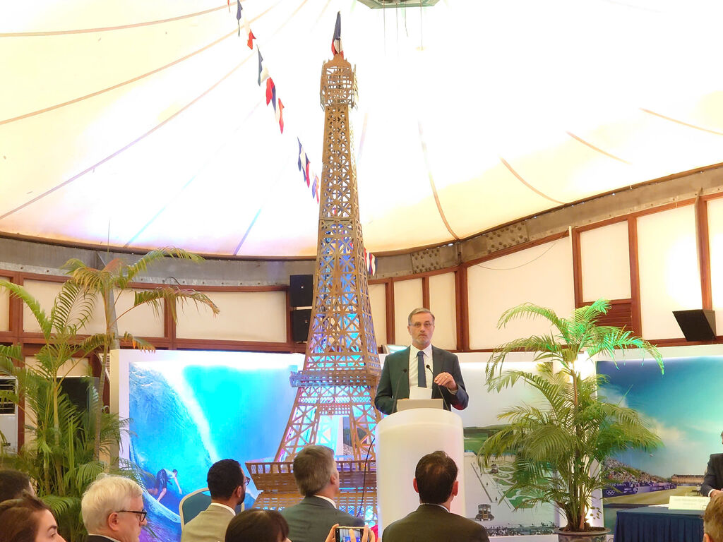 | L’ambassadeur de France au Vietnam, Olivier Brochet, prend la parole au point presse, le 11 septembre à Hanoï. |