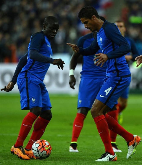 | Ngolo Kanté et Raphaël Varane lors du match amical contre la Russie, le 29 mars au Stade de France. |