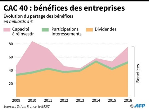 "La France est le pays au monde où les entreprises cotées en bourse reversent la plus grande part de leurs bénéfices en dividendes aux actionnaires", assure le rapport intitulé CAC 40: des profits sans partage, réalisé par Oxfam et le Bureau d'analyses sociétale pour une information citoyenne (Basic).