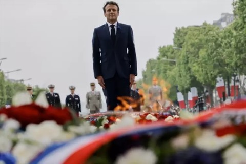 | Le président Emmanuel Macron dépose une gerbe de fleurs sur la tombe du soldat inconnu à l'Arc de Triomphe, à Paris le 8 mai. |