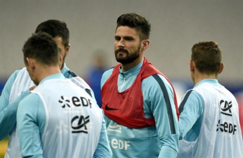 | L'attaquant de l'équipe de France de football Olivier Giroud (en rouge) à l'entraînement au Stade de France, à Saint-Denis, le 12 novembre, à la veille du match amical contre l'Allemagne |