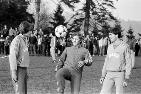 | Michel Hidalgo fait admirer sa technique sous les yeux de ses joueurs Daniel Bravo (gauche) et Manuel Amoros, le 21 février 1982 à Jouy-en-Josas, près de Paris. |