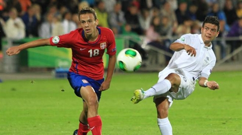 | Le Français Adrien Hunou (droite), lors de la finale de l'Euro 2013 de football des moins de 19 ans, jeudi 1er août à Marijampole (Lituanie). |