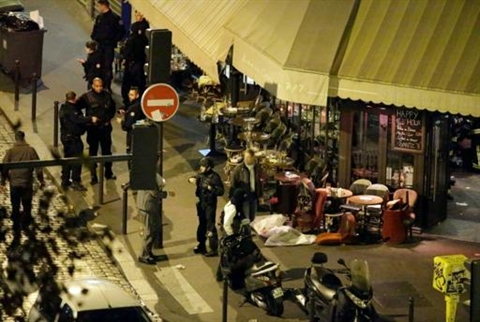 | Des victimes allongées sur le sol après les attaques terroristes le 13 novembre 2015 à Paris. |