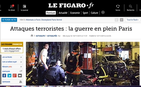 "La guerre en plein Paris", titre Le Figaro de samedi. "Cette fois, c'est la guerre", renchérit Le Parisien, dix mois après une vague d'attentats jihadistes à Paris qui avaient suscité une réaction inédite avec des manifestations contre le terrorisme réunissant plusieurs millions de personnes en France.