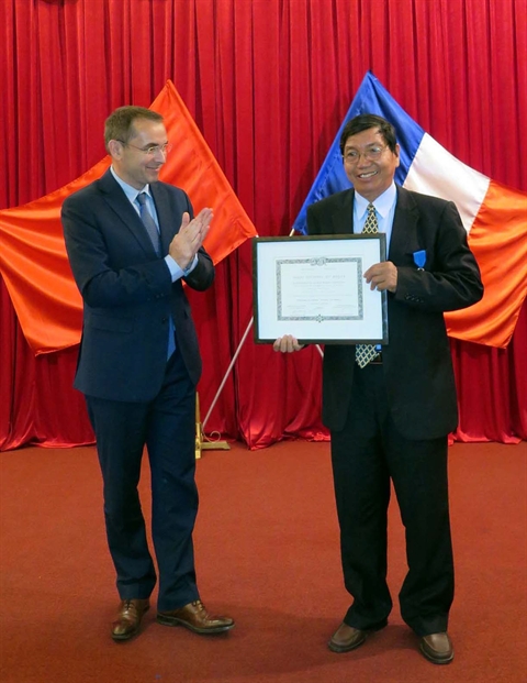 | L'ambassadeur de France au Vietnam, Jean-Noël Poirier (gauche), remet l'insigne de l'Ordre national du Mérite à Nguyên Van Mê. |