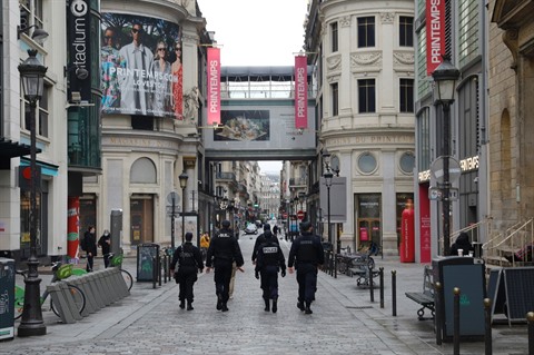 | Des policiers en patrouille près du magasin Le Printemps à Paris, le 31 janvier au lendemain de la fermeture des centres commerciaux en France pour lutter contre l'épidémie de coronavirus. |