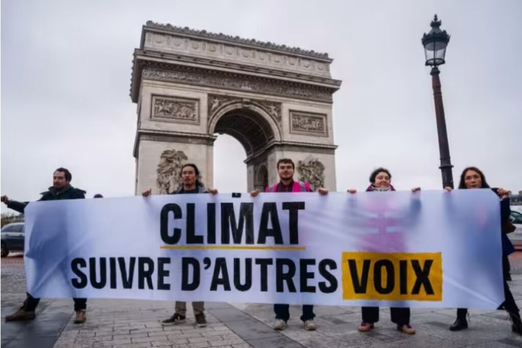 | Des militants tiennent une banderole "Climat, écoutez les autres voix" lors d'une action de Greenpeace devant l'Arc de Triomphe à Paris, le 12 décembre. |