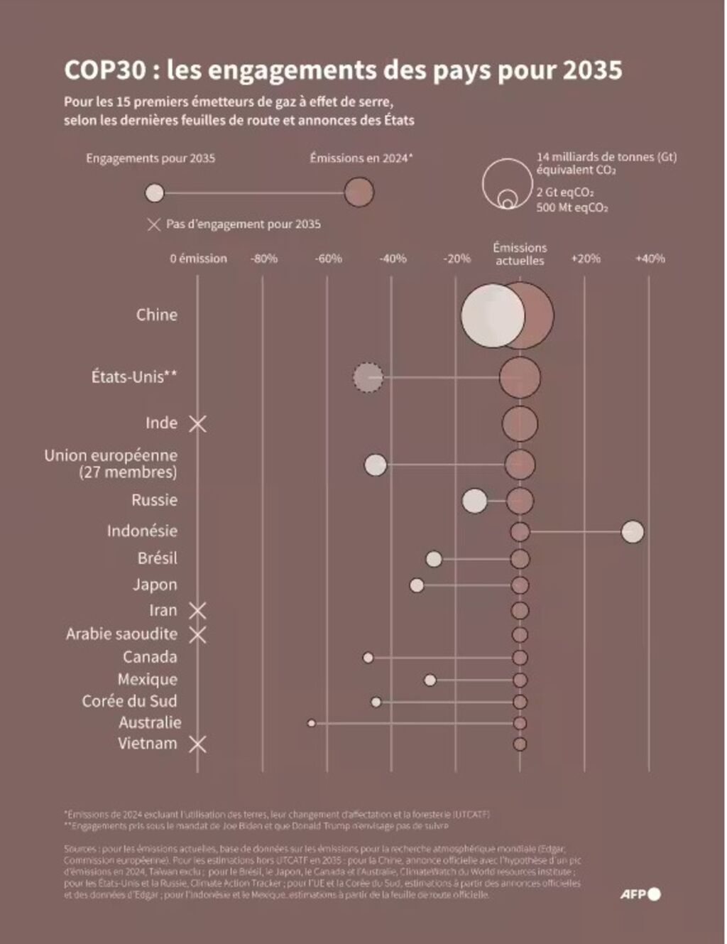 | Comparaison des volumes d'émissions de gaz à effet de serre actuels des 15 principaux émetteurs en 2024 avec leurs engagements pour 2035. Photo : AFP/VNA/CVN |