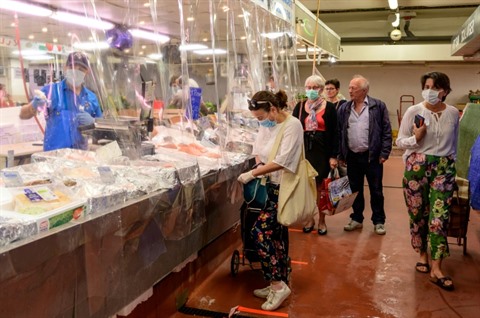 | Un poissonnier protégé derrière son étal sert des clients sur le marché de Perreux-sur-Marne, le 19 avril. |