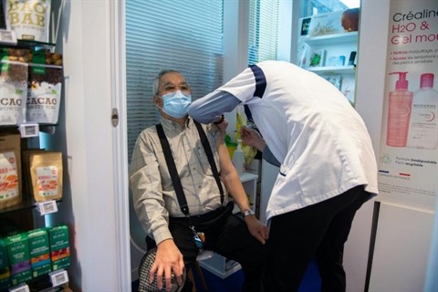 | Vaccination avec AstraZeneca dans une pharmacie à Paris, le 12 mars. |