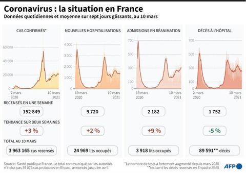 Selon l'agence sanitaire Santé publique France, 90.146 personnes sont mortes du COVID-19 depuis le début de l'épidémie dans les hôpitaux et les établissements type Ehpad (dont 64.835 à l'hôpital), sans compter les décès à domicile. Ce décompte ne va pas s'arrêter là : avec 20.000 à 30.000 cas par jour (25.000 vendredi 12 mars), l'épidémie est loin de faiblir, et la situation est jugée particulièrement inquiétante en Île-de-France.