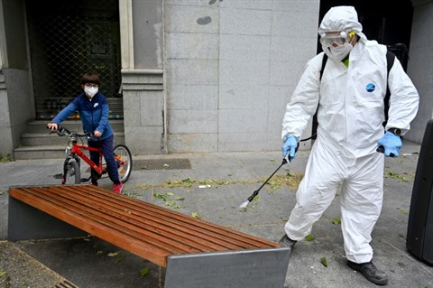 | Un agent désinfecte un banc public à Madrid, le 28 avril. |