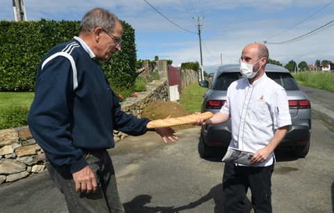 | Bruno Berterreix, boulanger, apporte sa baguette à un client à Souraide, dans le Sud-Ouest de la France, le 28 avril. |